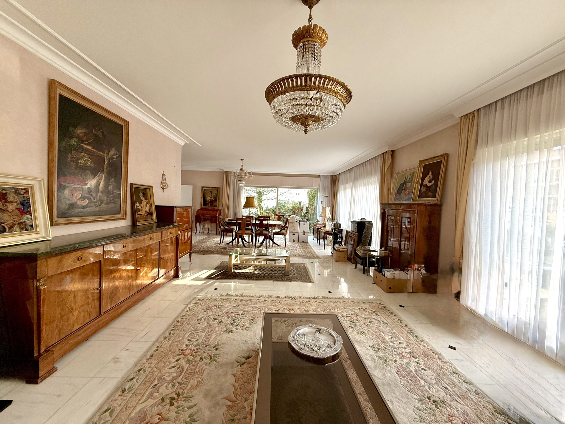 The house opens onto a spacious marble entrance hall with cloakroom and guest toilet. On the ground floor, it offers large and bright reception rooms of 82 sqm with an open fire and marble flooring, a spacious fully equipped kitchen, as well as a large room ideal for a liberal profession, currently arranged as a bedroom with a shower room.